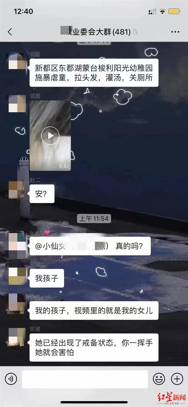 4月7日,一则视频在网络流传,网友称新都区一幼儿园教师对孩子施暴。从流传视频上可以看到,在教室里,一名身穿蓝色衣服的成年女性对一名女童明显大力掐脸、推搡、拉扯衣服,女童一度摔倒在地,并抱住成年女性的大腿,但又迅速站起来。旁边站有一名身穿白大褂的年轻女性,看了一眼,没有阻止,并缓慢踱步离开。画面一旁,一群孩子似乎排成圆圈,正在做游戏。