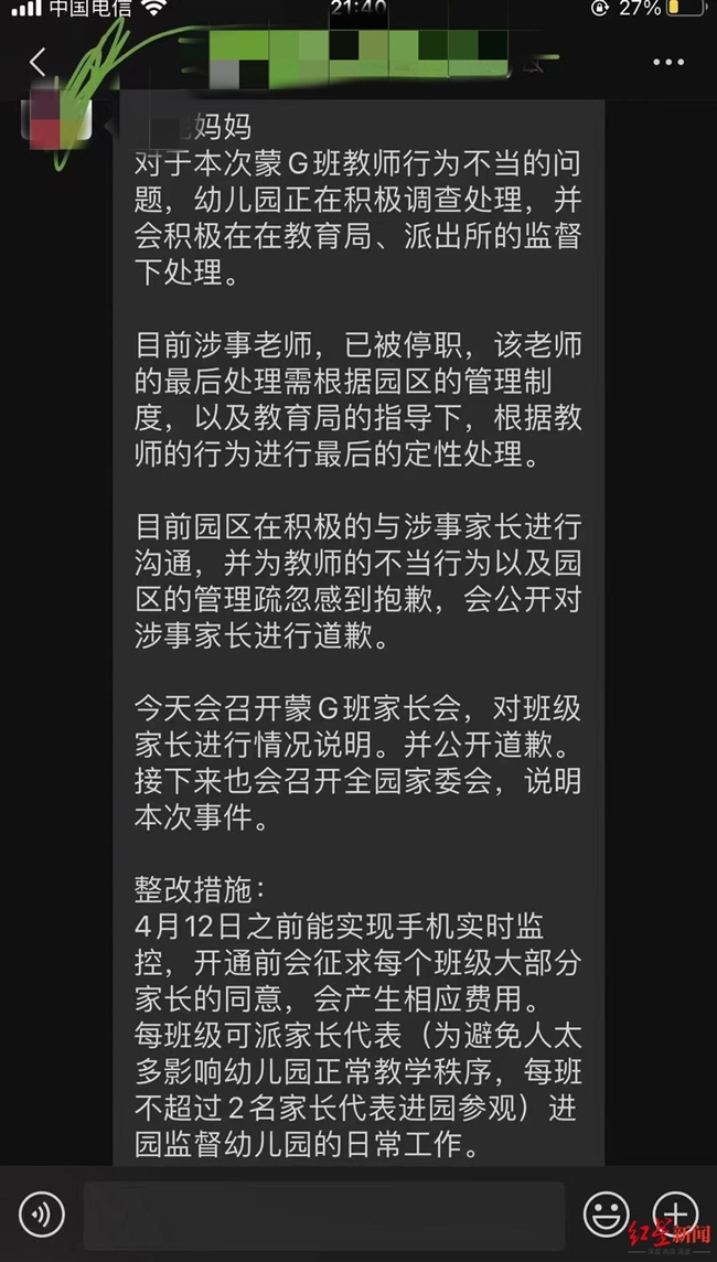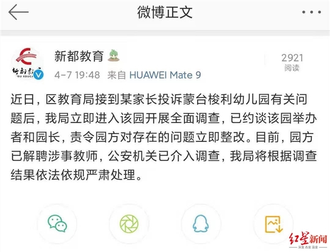 对此,4月7日晚,新都区教育局官方微博账号发布消息表示:近日,区教育局接到某家长投诉蒙台梭利幼儿园有关问题后,我局立即进入该园开展全面调查,已约谈该园举办者和园长,责令园方对存在的问题立即整改。目前,园方已解聘涉事教师,公安机关已介入调查,我局将根据调查结果依法依规严肃处理。
