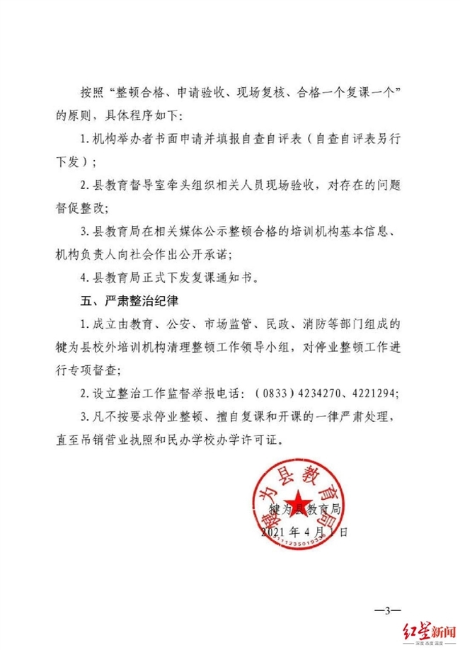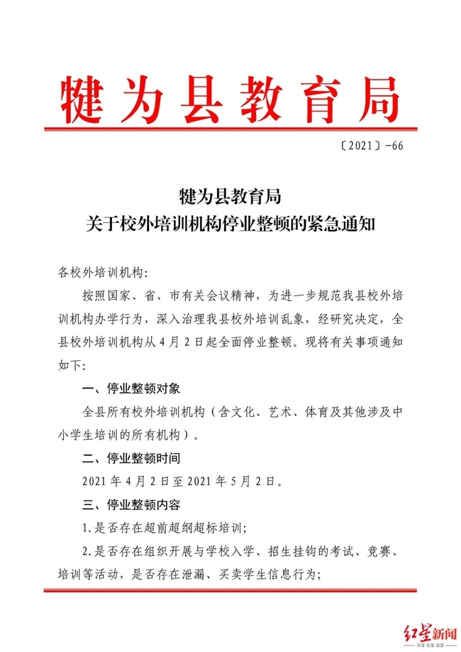 4月2日,“犍为教育”发布《犍为丨全县81家“校外培训机构”从4月2日起“全面停业整顿”》推文,文中提到,犍为县所有培训机构(含文化、艺术、体育及其他涉及中小学培训的所有机构)从4月2日起全面停业整顿,停业整顿时间到5月2日。记者向犍为县教育局相关负责人求证后得知,“(停业整顿)情况属实。”