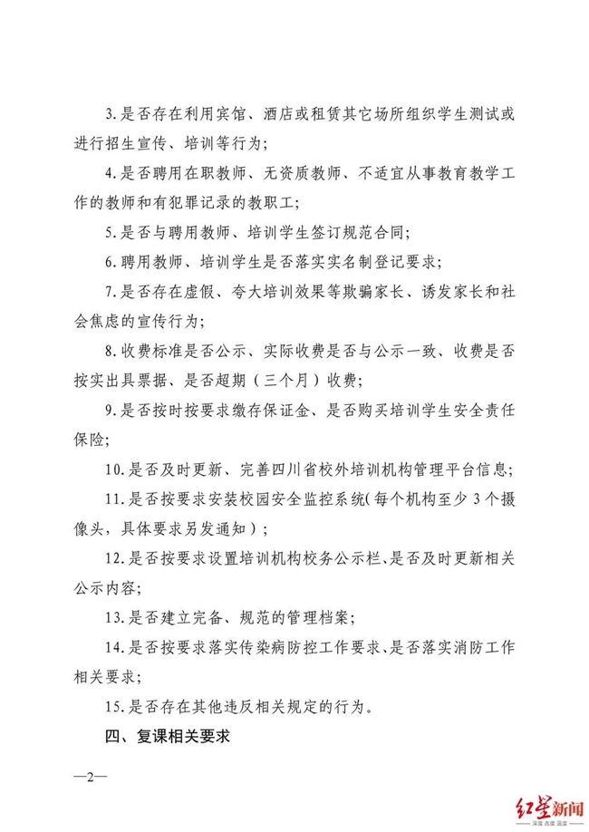 犍为县教育局:此前,通过明查暗访和家长电话投诉等途径,发现的问题有:家长抱怨收费高支出大、教师素质良莠不齐、培训效果与宣传差距较大、收费不出具票据、违规为外地学校组织招生考试、疫情防控常态化措施落实不到位、学生压力大、超前超纲教学、消防和应急演练还需加强、教师和学生实名制登记存在漏洞等问题。
