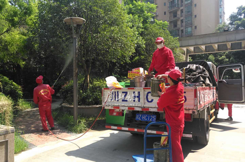 江公社区对辖区内各小区喷洒药物,开展除“四害”工作。