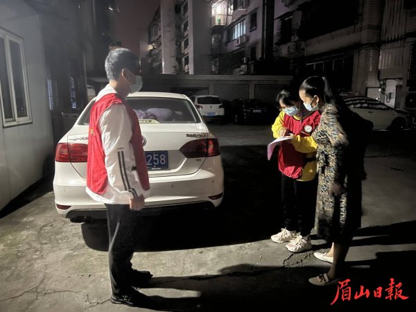 9月30日凌晨,在洪雅县芒硝厂小区门口,包保干部和小区志愿者正在值守,穿红马甲的工作人员对外出办事的住户进行查验登记后放行。大家纷纷表示,防疫工作人员通宵值守非常辛苦,工作做得非常扎实。