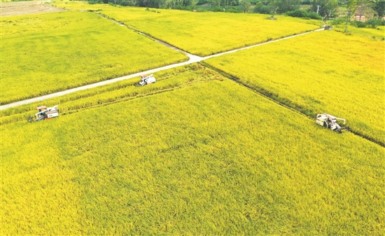 图为近日,在仁寿县珠嘉镇棚村村的稻田里,三台联合收割机正在进行水稻机收和秸秆还田“一条龙”作业。