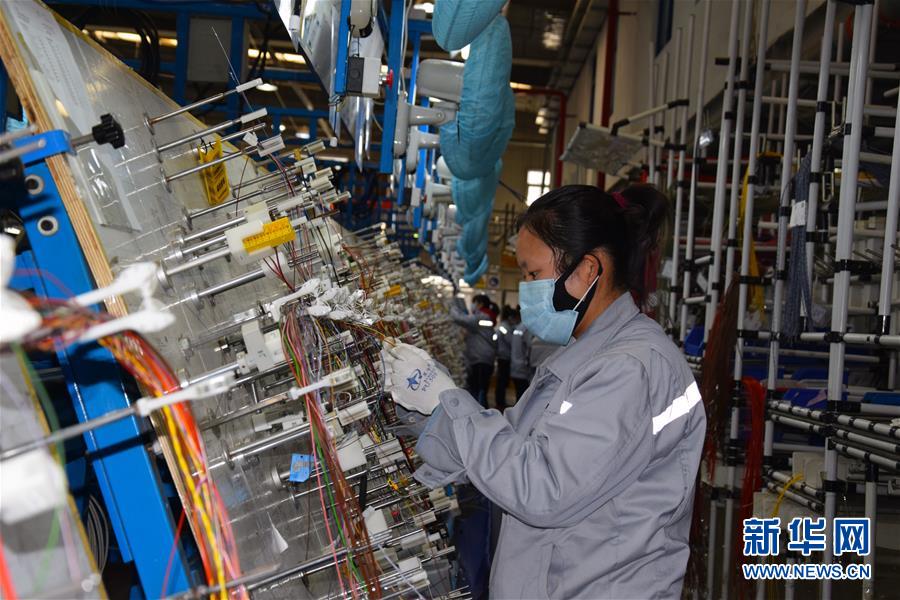 2月22日,在河北省三河市的廊坊莱尼线束公司,工人们在车间内进行布线作业。新华社发