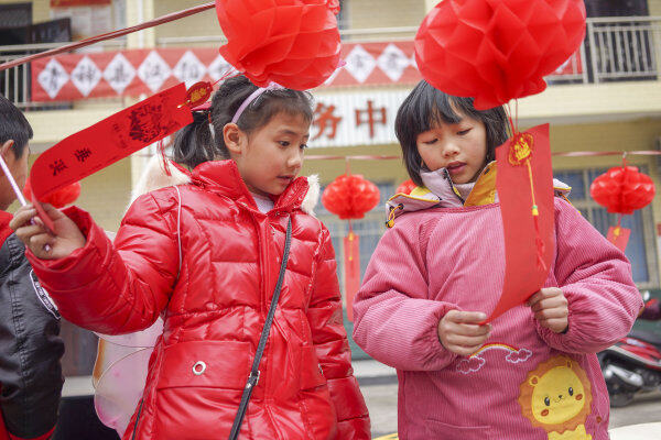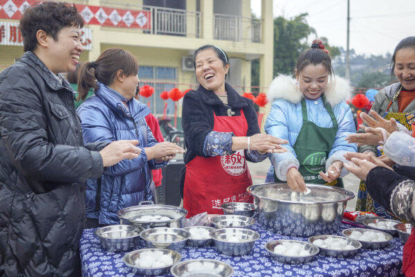 “卖汤圆卖汤圆,小二哥的汤圆是圆又圆,一碗汤圆满又满,三毛钱呀买一碗……”2月14日下午,在青神县汉阳镇文新村聚居点,四张桌子依次排开,村民们围在桌旁钩织冰墩墩、制作糖葫芦、做灯笼、还有人边唱儿歌边和面。孩子们围在桌旁,咬着手指、垫着脚尖,目不转睛地盯着会“变魔术”的大人们串糖葫芦,等待着草莓、橘子、山楂裹上糖衣,变成心心念念的冰糖葫芦。