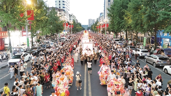 晚上8点,身着古装的表演人员走在前面,卖货郎、小花灯等队伍分散在巡游队伍两侧,各式造型独特的花灯美不胜收,为市民和游客带来了一场别开生面的文化盛宴。
