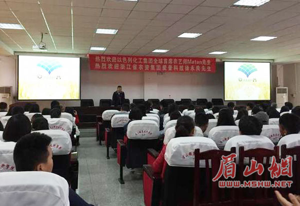 眉山网讯 3月30日上午,以色列化工集团全球首席农艺师Matan先生和浙江省农资集团爱普科技徐永良先生前来我校,在图书馆学术报告厅为现代农业技术专业180余名学生开展专题讲座。