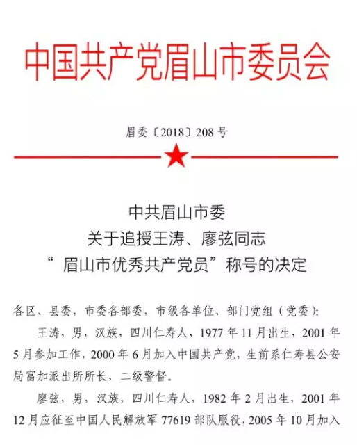 二、2018年8月20日,中共眉山市委追授王涛、廖弦同志“眉山市优秀共产党员”