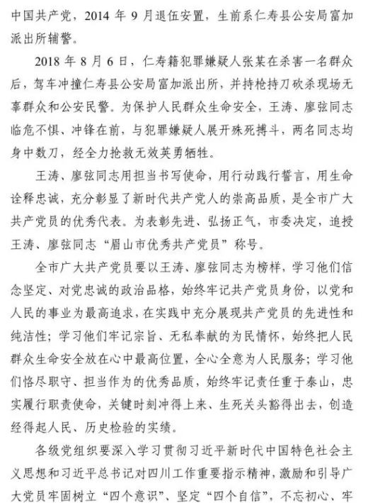 一、中共仁寿县委于8月17日作出决定,追授仁寿富加派出所牺牲民警王涛、廖弦两位同志“仁寿县优秀共产党员”称号,并号召全县广大党员干部群众向王涛、廖弦同志学习。