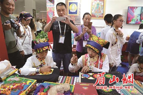 当天上午,四川省第九届中小学生艺术节展演活动艺术作品展在四川工商学院图书馆一楼举行。来自全省各市州的30个艺术工作坊参加了展演。展演作品包括剪纸、陶艺、布艺、年画、面塑、皮影、刺绣、茶艺等。