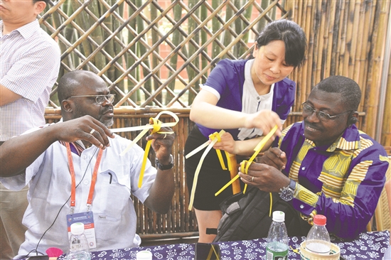 参加第五届中非民间论坛的非洲友人走进青神县竹编之乡非遗竹编培训室,体验青神竹编工艺。(资料图片)