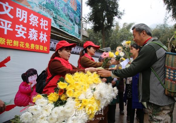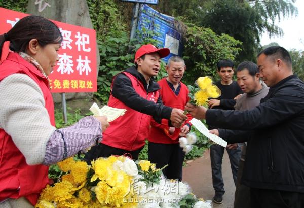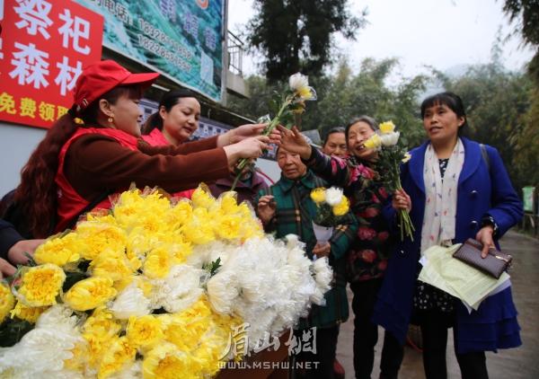 眉山网讯(记者 王丽 张忠苹)“你们这些鲜花用来干什么?”今(4)日上午9时许,青神县瑞峰镇天池村场镇通往林区的祭祀鲜花免费领取摊点刚“开张”,就吸引了不少路过的群众围观。