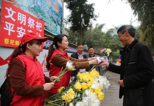 “您好!今年您可以用鲜花去祭拜,这些花都是免费的。”摊点前,两名志愿者手持鲜花和宣传单,一边向有需求的群众派送鲜花,一边宣传绿色环保祭祀理念,“烧纸钱等传统的祭扫方式既会造成空气污染,还可能引发森林火灾,希望您能采取鲜花祭祀等文明安全的祭祀方式。”“对对对,这个活动好,有意义!”活动现场,天池村村民李丽对文明祭祀方式很是支持,她认为用鲜花代替纸钱去祭拜既表达了哀思,也不会有引发森林火灾的危险,不会污染环境,这种祭扫方式文明、绿色、安全,值得提倡。