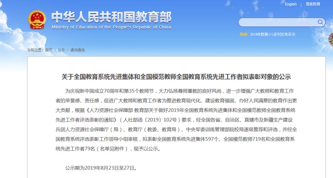 关于全国教育系统先进集体和全国模范教师全国教育系统先进工作者拟表彰对象的公示