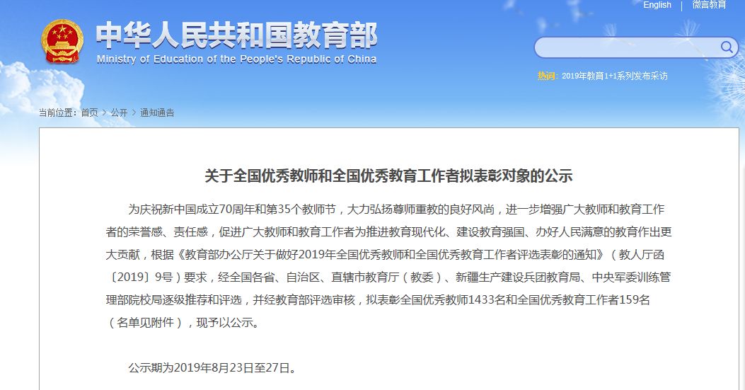 在第35个教师节来临之际,8月23日,教育部官方网站发布公示,拟表彰全国优秀教师1433名和全国优秀教育工作者159名,拟表彰全国教育系统先进集体597个、全国模范教师719名和全国教育系统先进工作者79名。