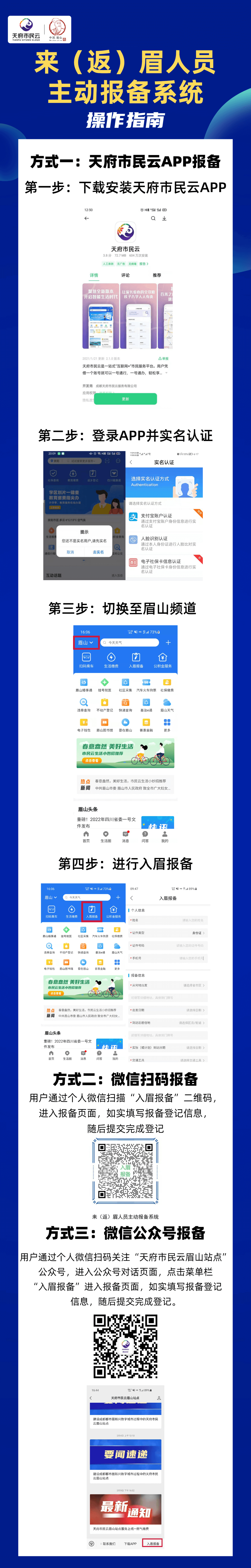 根据近期眉山疫情防控工作要求,凡从市外来(返)眉人员,需在来(返)眉人员主动报备系统进行报备。当前,可采用天府市民云APP端报备、微信扫码报备、微信公众号报备三种形式进行入眉报备,来返(眉)人员可以根据自身实际情况,选择最便捷的方式进行报备。