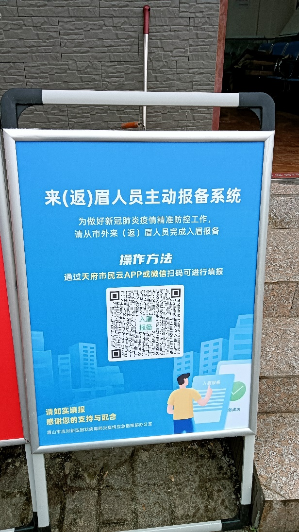 在眉山各个社区、村落,各个街道,都可以见到入眉报备的二维码,对来(返)人员提供了极大的方便。在天府市民云APP眉山站点也可以进行报备,通过智慧化的城市生活服务平台,集聚与市民相关的各种服务,为市民生活提供方便。