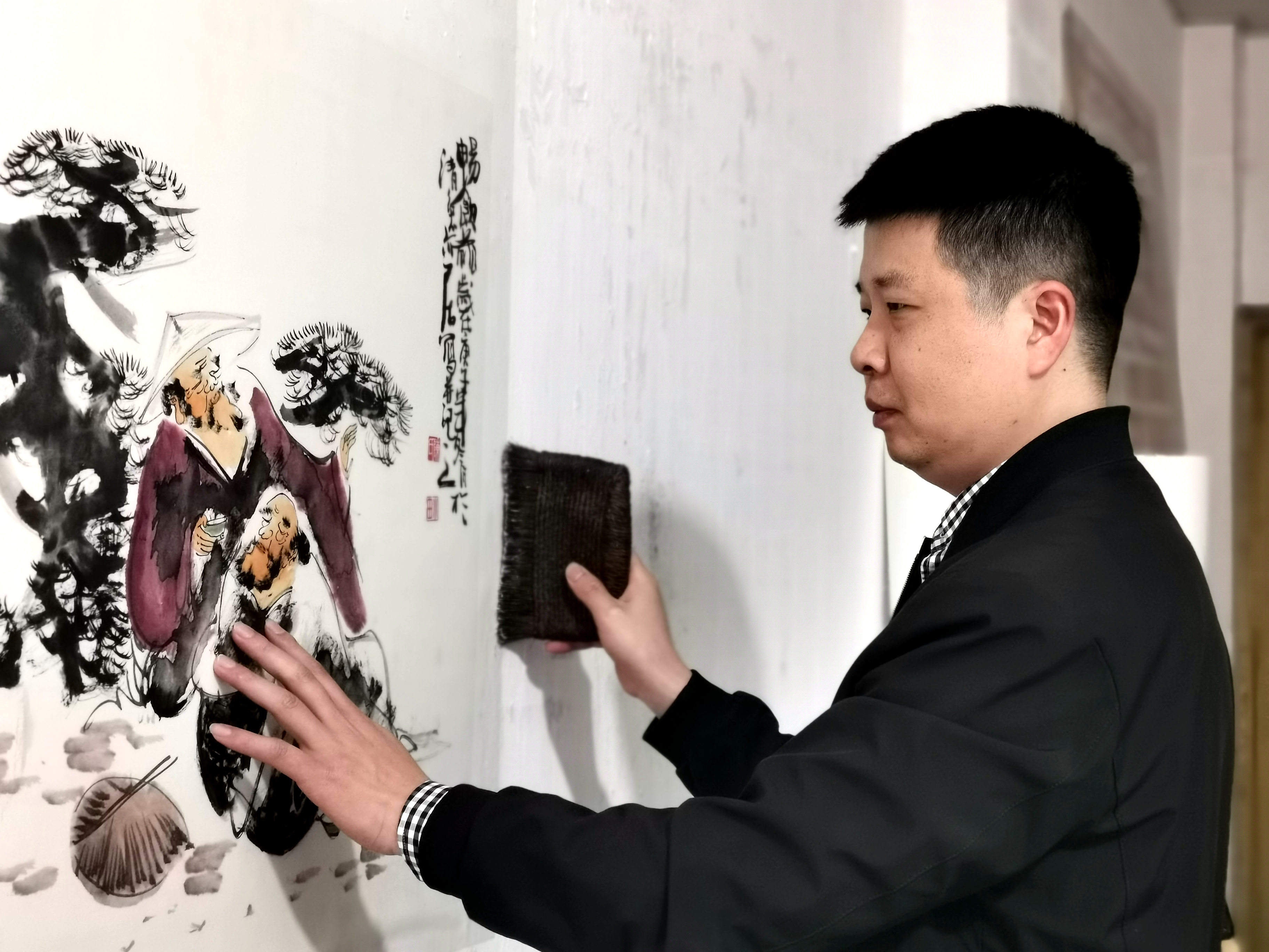 4月13日,记者见到宋李兵时,他正将墙上晾干的画心揭下来。他中等个子,黑白格子衬衣外套件夹克,动作麻利又仔细。画心每次揭下来的时候,多少会留下一些毛边。日积月累,这些墙满是经线和纬线的毛边,整个墙毛茸茸的。字画零星地贴在墙上,让枯燥的环境一下就有了灵气。