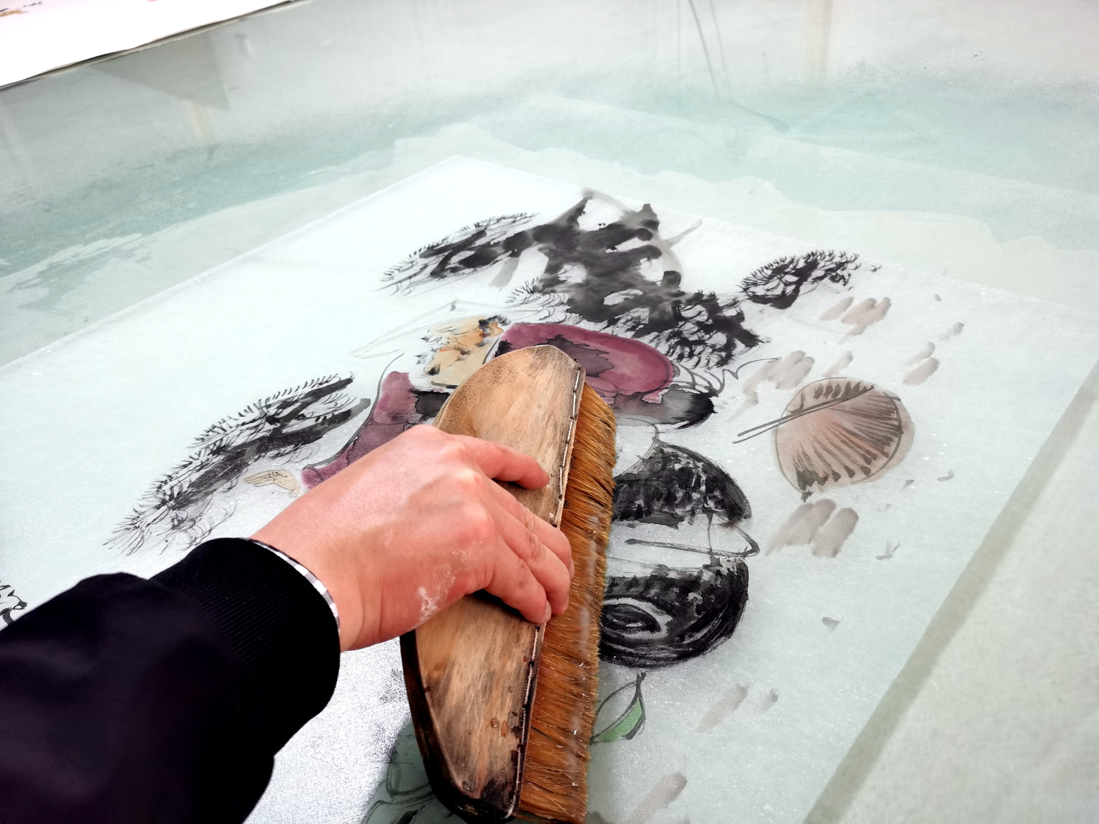 另一间单独的屋子,一张玻璃工作台占了大部分空间,墙上是待晾干的画心……