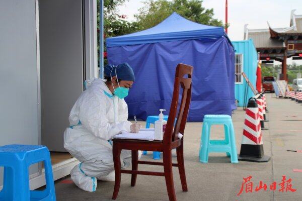 当天一大早,记者来到成乐高速眉山出口,虽然气温较高,但防疫人员们个个都是全副武装,站在出口外的防疫查验点,对过往车辆进行认真查验。“您好!请规范佩戴口罩,口罩把鼻孔遮好、捏紧,保持一米安全距离,扫一下这里的天府健康通,再出示一下行程码。”