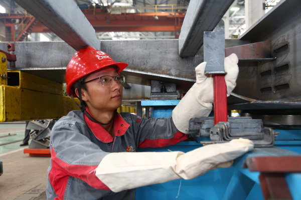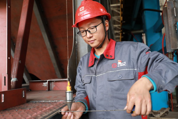 4月27日,走进中车眉山车辆有限公司制造中心组装区,耳边传来巨大的机械轰鸣声。在阵阵轰鸣声中,记者看到了头戴红色安全帽,身穿灰色工作服的甘俊林,他正站在火车车厢钢架构件前,手拿塞尺,一一测量钢构件的精准度。