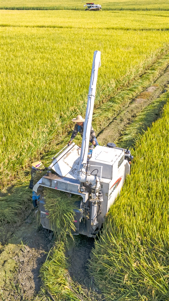 田间稻谷黄,农机收割忙。 黄伟 摄