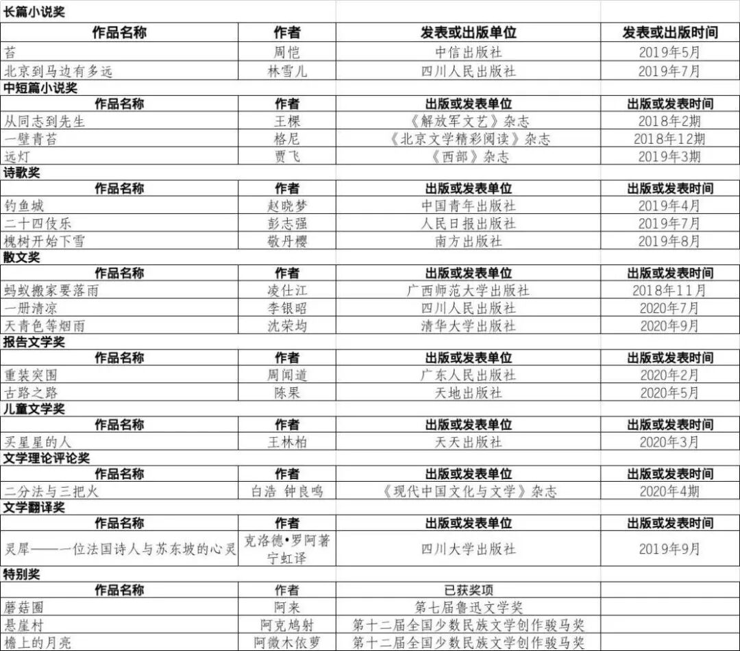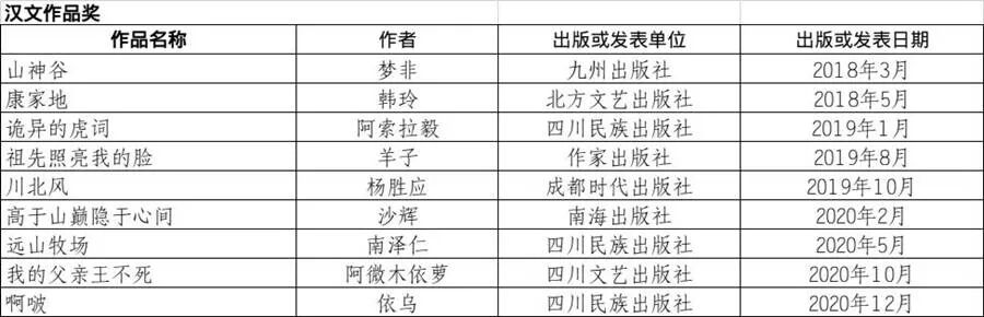 与第十届四川文学奖获奖名单揭晓同时,第八届四川省少数民族文学创作优秀作品奖也揭晓了获奖名单,本届一共有13件作品获奖。