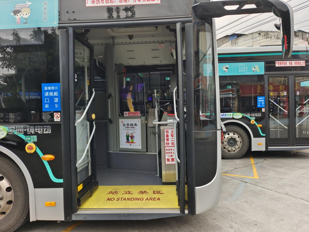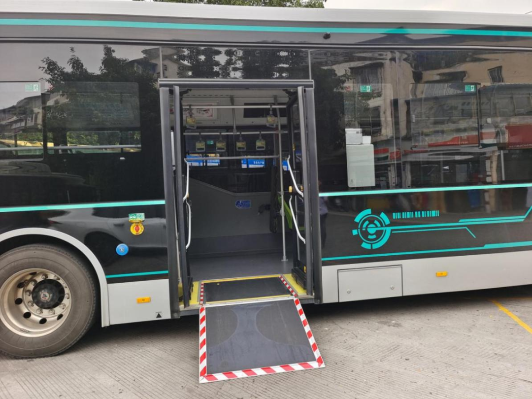 “第一个是该线路配置纯电动公交车,内部采用低入口结构的一级踏步,方便老年乘客上下车;其次是加装了中门手动折叠踏步,方便乘坐轮椅的老年人和残疾人上下车;第三个我们对地板也进行了防滑处理,对座椅还有扶手等进行了适老化设计和改造。”