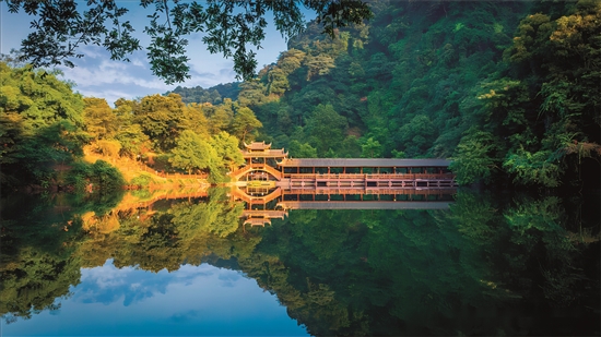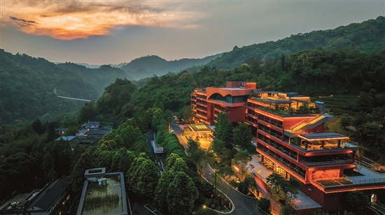 走进老峨山居酒店,墨香与茶韵扑面而来。入住酒店的游客欧晓琴正在体验非遗雕版印刷:“大厅里可以观赏‘笔起峨山韵、山居颂丹青’书画,大厅外可体验非遗雕版印刷,推开窗户就能看见‘灵山睡佛’,这样的假期太惬意了。”这座书院式酒店巧妙融合了茶道、书画等传统文化元素,让游客在休憩之余,得以深度感受中华优秀传统文化魅力。