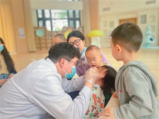 医护人员入园开展儿童保健。