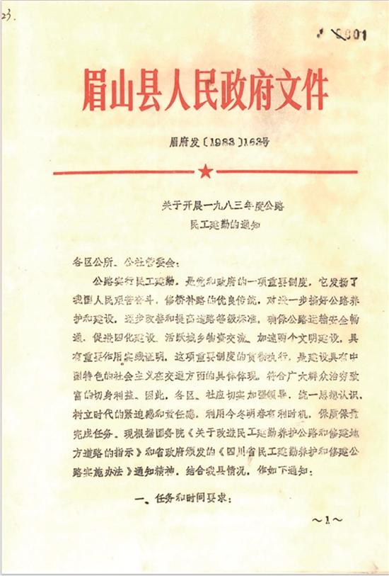 馆藏乐山地区交通局《关于1983年度民工建勤加宽公路情况汇报》中指出:“眉山坚持民工建勤、民办公助的方针,搞得很出色,全县85%的公路焕然一新。”眉山的成功在于把“民工建勤、民办公助”从政策口号转化为可操作的机制。