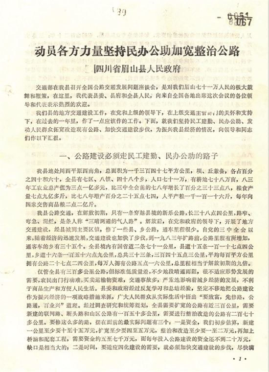 馆藏1984年四川省眉山县人民政府《动员各方力量坚持民办公助加宽整治公路》的档案中开篇即直击痛点:“1983年扩路前,全县345.3公里公路中,标准低、质量差,不少地段晴通雨阻,农民出门行动难,买卖运输物资难,交通事故多。”