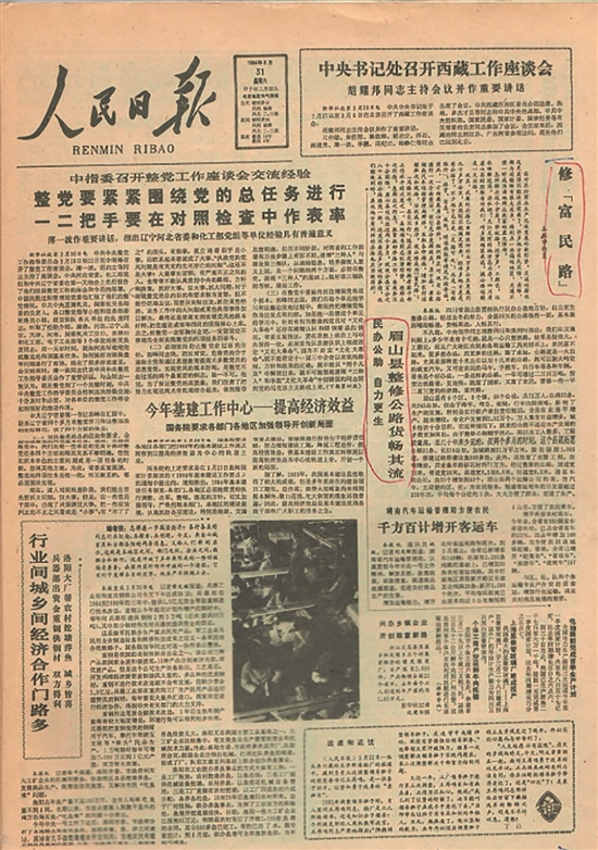 1984年,原眉山县在全国率先提出“要想富,先修路”这一具有里程碑意义的口号。同年3月31日,《人民日报》头版刊发报道《民办公助 自力更生——眉山县整修公路货畅其流》,并配发评论员文章《修“富民路”》,让这句呐喊一夜间响彻全国。