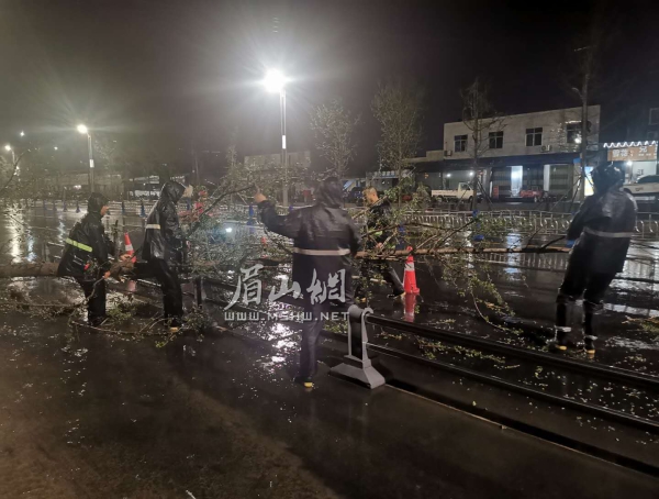 11日夜间崇礼镇干部坚守防汛一线,迅速归置吹倒树木。